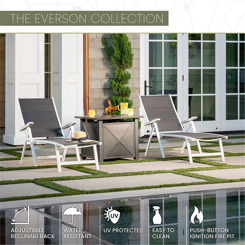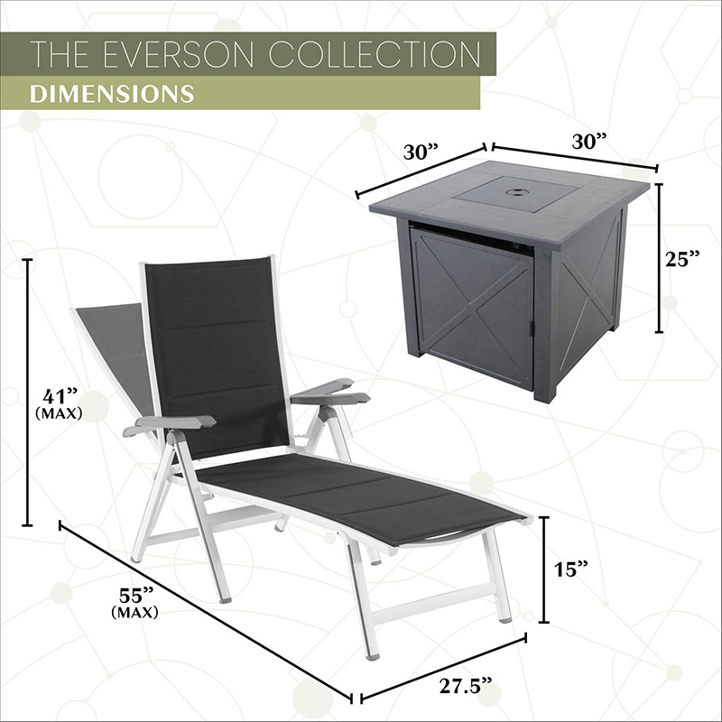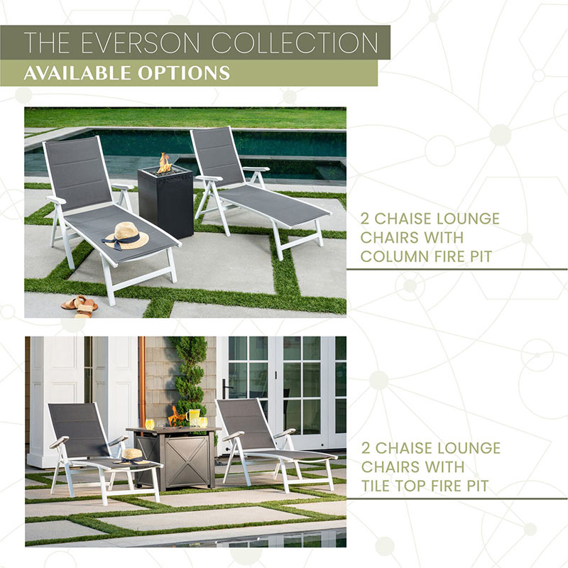 - MODERN STYLISH DESIGN: The Everson Collection by Mod Furniture is all about comfort. Take a seat in one of the two super elegant and comfortable padded sling chaise lounge chairs. Our tile-top fire pit rounds out of the set providing dual purpose as a modern coffee table when not in use, cover the burner with the included lid for added surface space.
