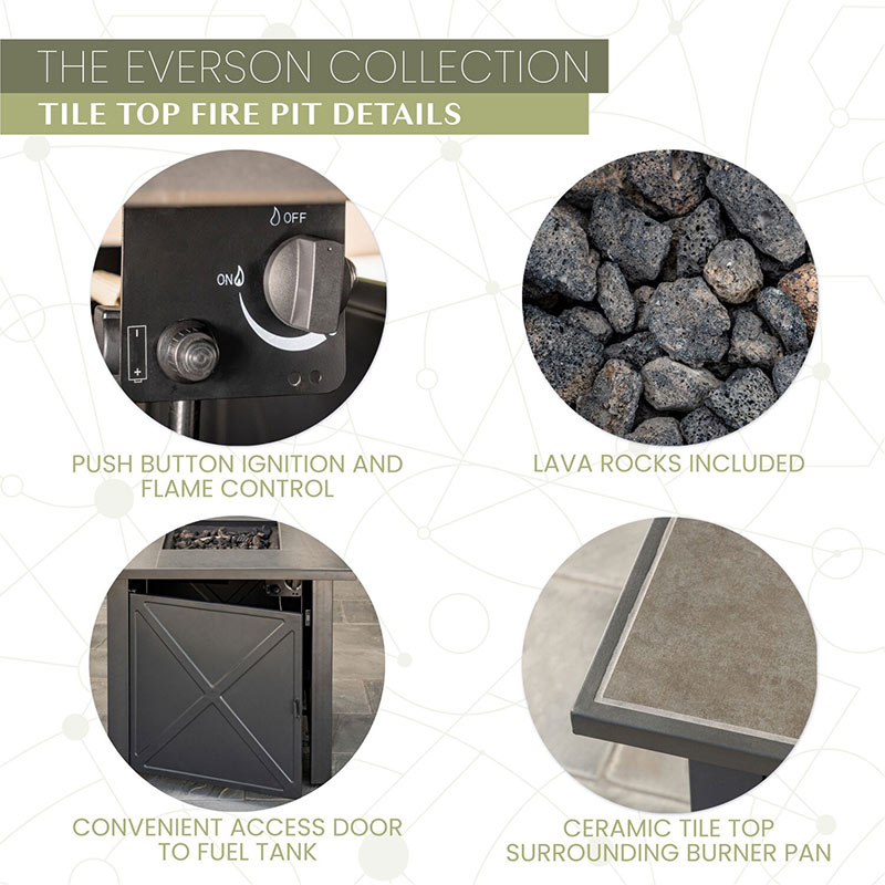 - SET DIMENSIONS: 46.45″D x 22.44″W x 14.76″H, Weight Capacity: 300 lbs. Fire Pit Dimensions: 30″x30″x25″, Burner Dimensions (inches): 13.4 D x 13.4 W x 2 H, Tile-Top Thickness: 0.98 inches, Weight Capacity: 50 lbs.