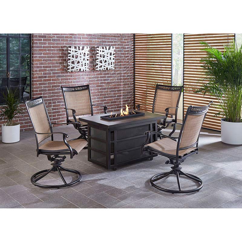 - COZY DESIGN: The Fontana fire pit chat set by Hanover is crafted with sophistication and beautifully designed to provide comfort to your outdoor space. Set includes 4 sling cast aluminum swivel rocker chairs and choice of fire pit. The chairs feature sling-back seats that provide upper and lower back support as you relax by the fire. Easy push button ignition and access to gas tank. Designed to fit any backyard, patio, deck, or porch.