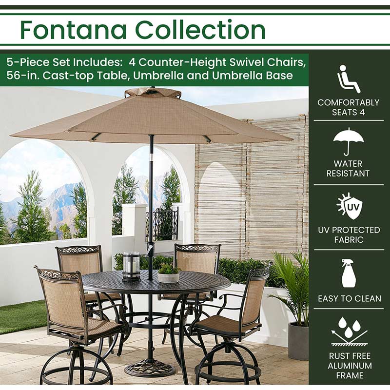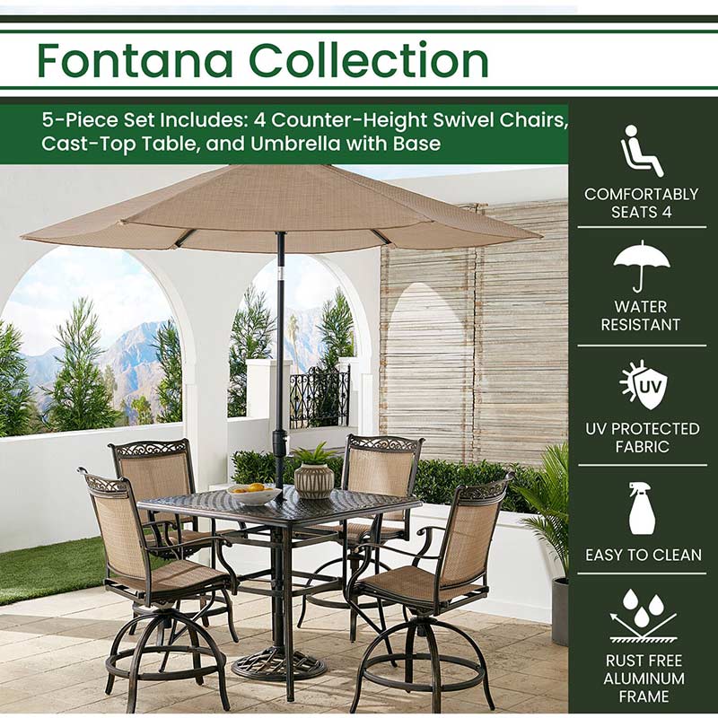 Take outdoor dining to the next level with the Fontana 5-piece high-dining set from Hanover. This set includes four sling-back swivel chairs and choice of style of table with options for including a 9ft. umbrella and base. The chairs and table are constructed with heavy-duty aluminum frames, dressed with elegant cast details, and finished with a protective bronze coating. Each chair performs a 360-degree spin with ease and is created using premium PVC sling fabric to provide unprecedented durability and comfort. The neutral-toned fabric blends perfectly with any décor, in addition to being moisture-, stain- and UV-resistant. Each dining table offers ample room for food and beverages as well as a generous amount space for entertaining guests. The 9-ft. umbrella option features an easy-crank lever that allows you to quickly and easily adjust the angle and pivot of the umbrella to keep you and your guests relaxed in the shade from sunrise to sundown. It comes with a 20-lbs. base to hold your table umbrella securely into place. A pivot under the ribs allows you to adjust the angle of shade to your preference, making it an ideal accessory to have – rain or shine. Designed for hosts who enjoy entertaining outdoors, let the Fontana dining collection provide the perfect setting for your next outdoor meal.
