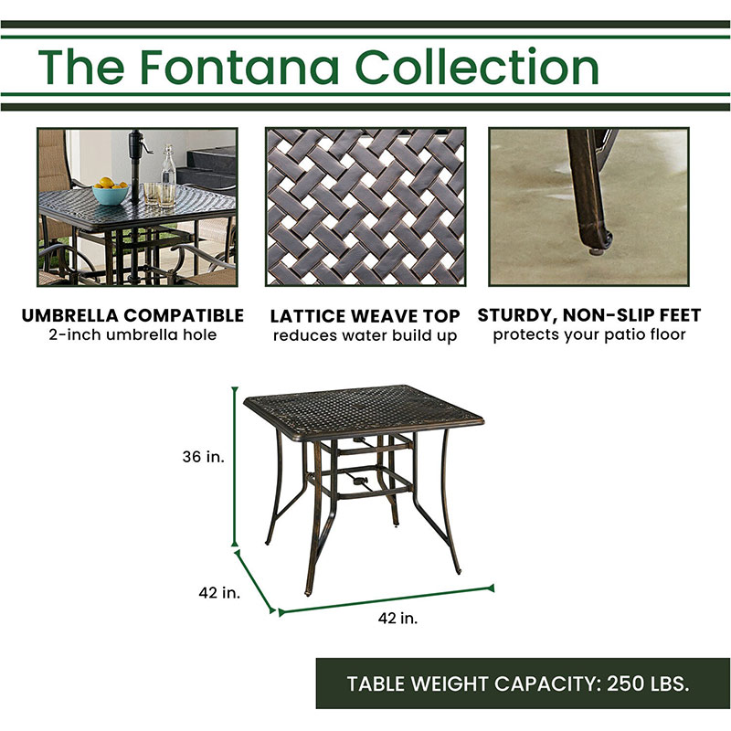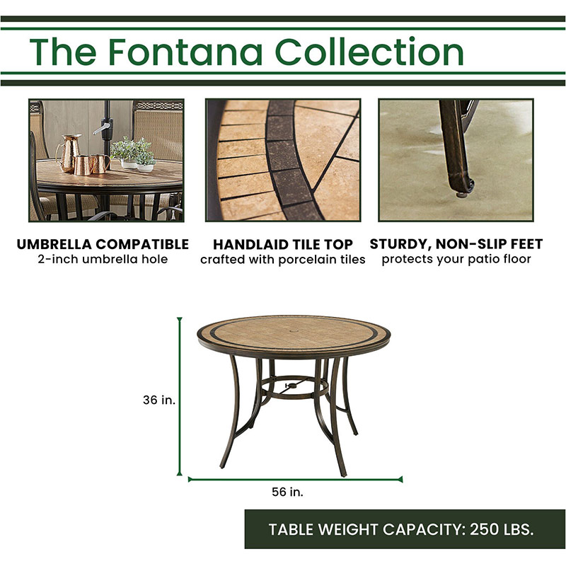 - DINING SET DIMENSIONS: Overall Chair: 25.7″D x 24.6″W x 37.2″H, Chair Seat : 20″D x 20.5″W x 26.5″H, Chair Weight Capacity: 250 lbs., Table: Square Cast-Top Table: 42″D x 42″W x 36″H or Round Cast-Top or Tile-Top Table: 56″D x 56″W x 36″H. Umbrella: 104.33″ D x 104.33″W x 99.6″H, Umbrella Base: 19.8″D x 19.8″W x 11.81″H