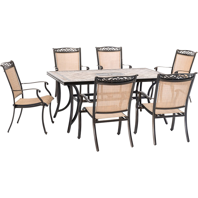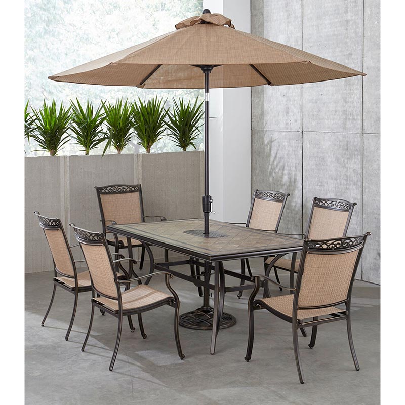 Transform your backyard into a sophisticated outdoor entertainment area with the Fontana 7-piece dining set by Hanover. This set includes one extra large dining table and choice of style of 6 chairs with an option for a 9-ft. market umbrella and coordinating umbrella stand. Both practical and refined, this set creates an alluring centerpiece for your backyard and adds extra convenience and functionality while you’re entertaining guests outdoors. This tabletop is constructed with premium tempered glass that is both durable and easy to clean. Each piece is constructed with heavy-duty aluminum frames that naturally resist rust and corrosion. The chairs are bound with durable PVC sling fabric and contoured for the ultimate back support. Laser-cut accents sweep across the top of each chair, adding even more appeal to the collection. Designed to last, this outdoor dining set will provide an elegant, natural setting for many meals with your loved ones in the comfort of your own backyard.