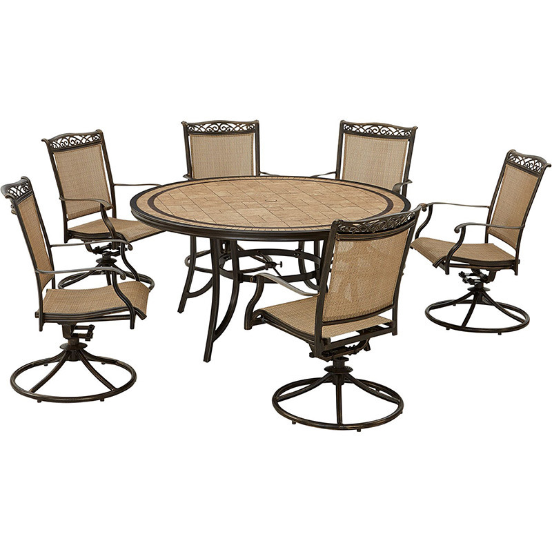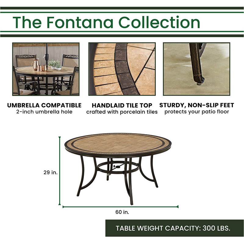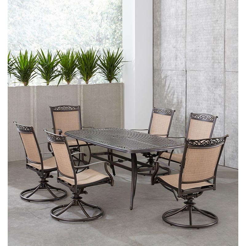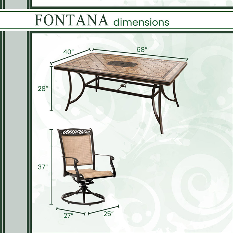- SOPHISTICATED DESIGN: The Fontana Dining Collection by Hanover includes a 7 piece dining set. This set includes a dining table and six chairs with an option for a 9 ft. table umbrella and stand. Designed with contemporary dark frames and neutral-toned fabric, this furniture set is perfect for revamping any outdoor space like a backyard, or patio.