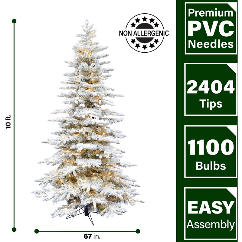 The10-ft. Mountain Pine flocked artificial Christmas tree from Fraser Hill Farm features a natural A-line silhouette with extremely lifelike foliage and all-metal hinged branch construction. A heavily flocked finish was designed to resemble freshly fallen snow that is true to season and produces a natural effect. Fraser Hill Farm produces the most realistic trees on the market, featuring all the long-term benefits that come with owning an artificial tree. The tree needles are constructed out of non-allergenic and flame-retardant materials. These details create the look of a natural tree and require no maintenance. The EZ Connect feature makes assembly a breeze by auto locking each tier securely into place. Leave your old tangled string lights behind this year. Simply unfold out of storage, fluff and decorate! This model is prestrung with 1,100 clear Smart lighting, a system of lights that will remain lit even if one bulb burns out. Designed to last, the Mountain Pine tree provides style and convenience.