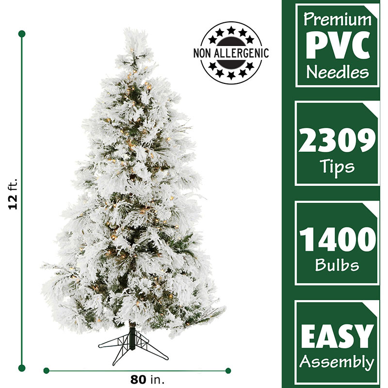 - 12.0-FT TALL: Standing 12.0-ft. tall with a 80” diameter this snow flocked Christmas tree will make a statement. From grand entryways to cathedral ceilings, this size tree will be the focal point of your home. The deep, layered branches will hold all of your family’s heirloom ornaments. Unleash your inner designer and create a perfectly decorated tree!