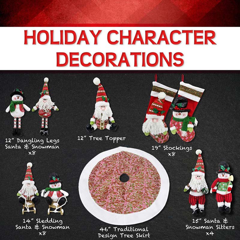 - Not your average ornament set: Tree topper, tree skirt, 8 full-size stockings, and plush floor figurines included