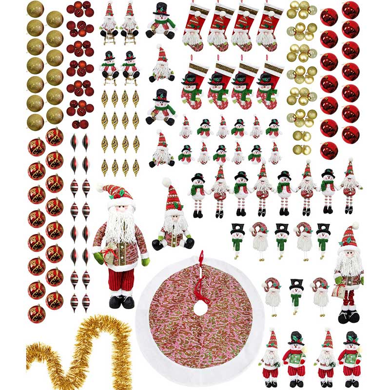 - MIXED-MATERIAL ORNAMENTS AND DÉCOR: This is not your typical 196-piece set of ornaments. This all-in-one set includes a sparkling tree skirt, 7-ft. gold garland, 8 matching stockings, tree topper, shatter-resistant bulbs of varying sizes and shapes, plush mantel decorations, freestanding plush figurines, and a glittery assortment of Santas, snowmen, and a variety of finial ornaments to complete the look! This is truly a decorator’s dream set!