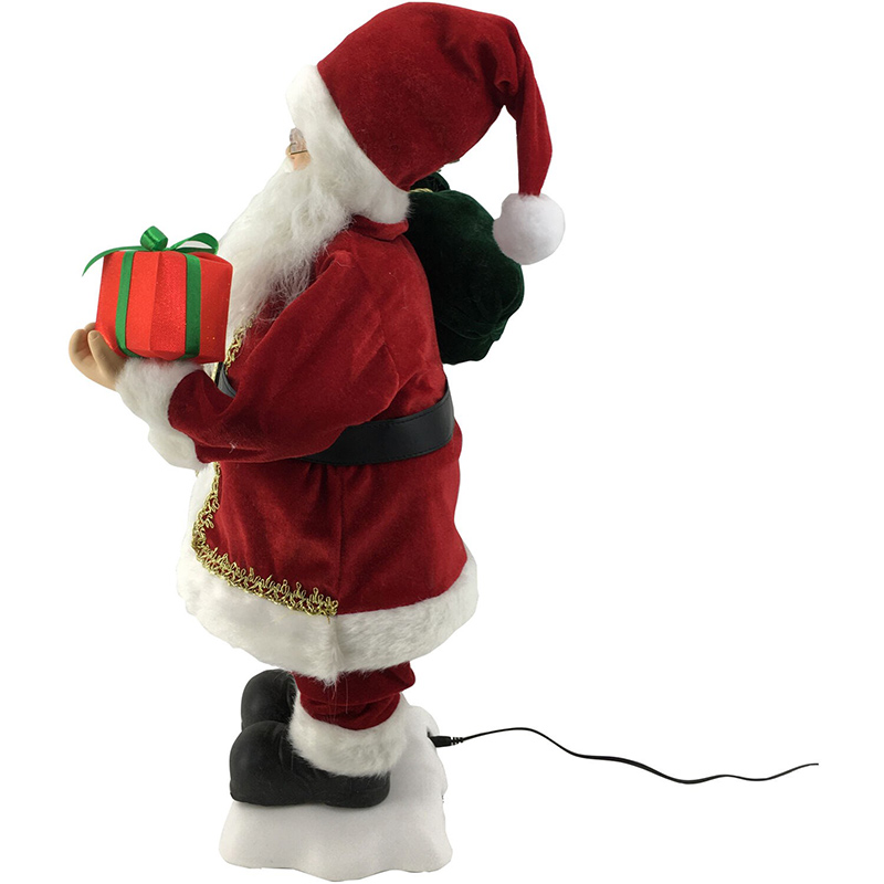 - Festively dressed Santa Claus figurine moves his head and arms with or without music while holding a lighted gift box and toy sack