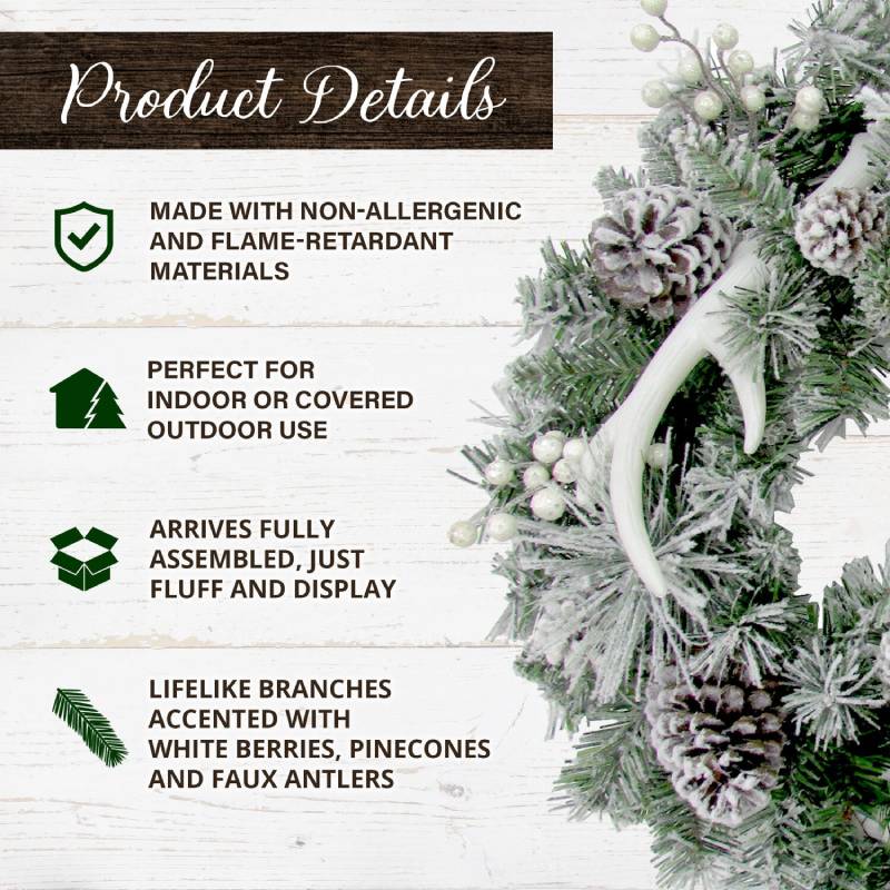Spruce up your holiday decor with a 24-inch round artificial wreath from Fraser Hill Farm. Featuring snowy, lifelike needles that resemble natural, evergreen branches, dusted by the first snowfall of the year, this wreath brings all the realistic detail of a live wreath, but with durability that will last year after year. Made with flame-retardant and non-allergenic materials, this Christmas classic is the perfect alternative to the real thing. Accented by real pinecones, white artificial berries and faux antlers, it brings a festive spirit whether you’re decking the halls indoors or out. Hang on your door to welcome each guest with cheer that will last from one holiday season to the next.