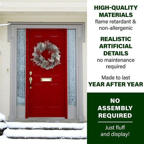 - Lifelike wreath is expertly flocked to resemble the first snowfall of the year