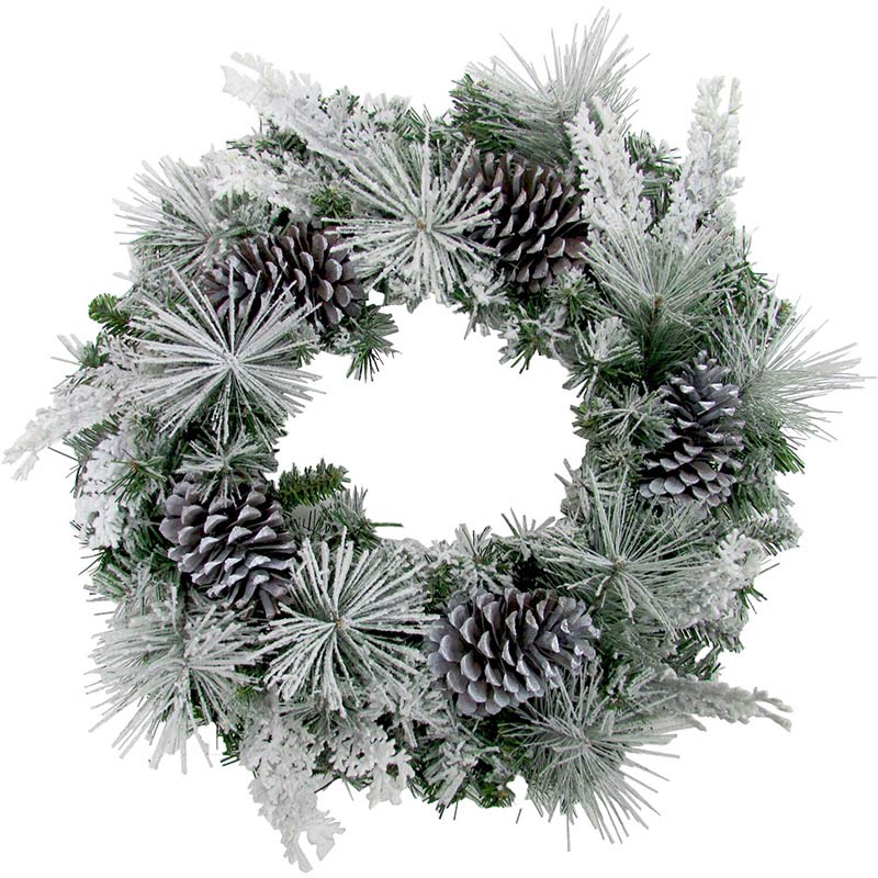 - DESIGNER FINISHES: Handcrafted snow flocked wreath trimmed with festive oversized pinecones. Suitable for indoor or covered outdoor use.