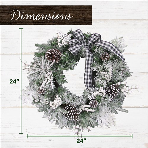 - Handcrafted snow flocked wreath trimmed with festive pinecones, berries, and a fashionable black and white buffalo check ribbon bow. Suitable for indoor or covered outdoor use.