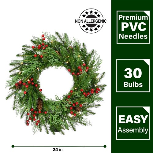 - This modern farmhouse inspired mixed pine wreath trimmed with red berries and pinecones is the perfect addition to your holiday decor. Battery-operated warm white, LED lights eliminate the hassle of plugs for easy display.