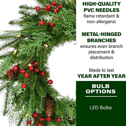 Fraser Hill Farm 24″ Wreath with Pinecones and Berries with White LED Lights Features: