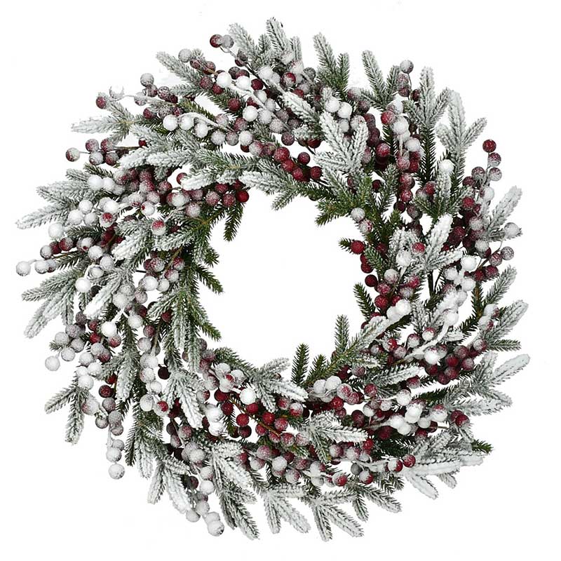 - DESIGNER FINISHES: This modern farmhouse inspired snow flocked pine wreath trimmed with red berries is the perfect addition to your holiday decor. Suitable for indoor or covered outdoor display.