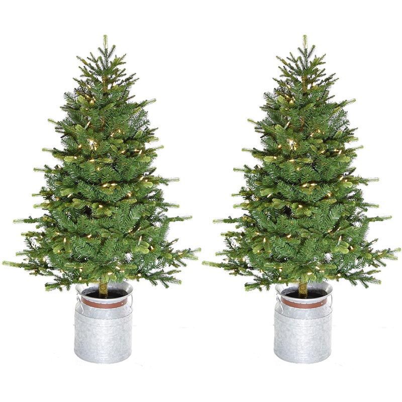 Spruce up your doorway this holiday season with the timeless appeal of these set of two porch accent trees that are potted in rustic farmhouse metal jugs. Spend less time and money this year replacing your natural porch trees. Instead, invest in one of our premium artificial designs that will provide decades of use. come pre strung with 100 warm white bulbs that will illuminate any room, porch, or space this holiday season. Our accent porch trees feature luscious green foliage and are made with quality, maintenance-free materials that will last season after season. The branches display multiple shades of green PVC needles that will instantly add a pop of color and natural look with any frosty scene. Simply unbox, fluff the branches, and enjoy the beauty and long-term benefits that come from owning an artificial design from Fraser Hill Farm.