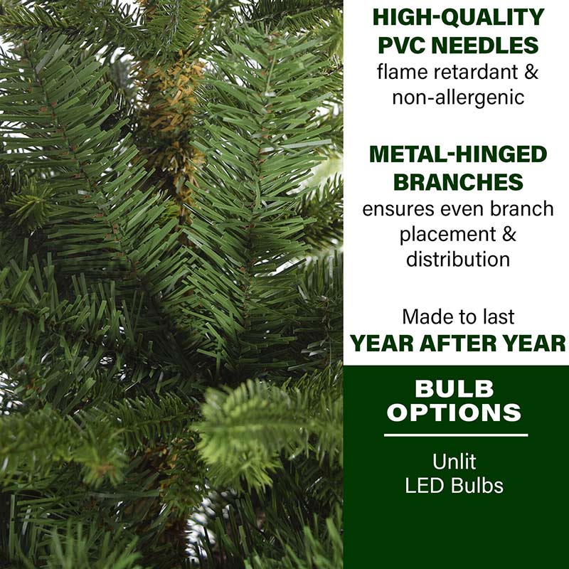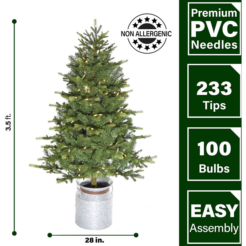 Spruce up your doorway this holiday season with the timeless appeal of this porch accent tree that is potted in a rustic farmhouse metal jug. Spend less time and money this year replacing your natural porch trees. Instead, invest in one of our premium artificial designs that will provide decades of use. This tree is prestrung with 100 warm white LED lighting that will illuminate any room, porch, or space this holiday season. Our accent porch tree features luscious green foliage and is made with quality, maintenance-free materials that will last season after season. The branches display multiple shades of green PVC needles that will instantly add a pop of color and natural look with any frosty scene. Simply unbox, fluff the branches, and enjoy the beauty and long-term benefits that come from owning an artificial design from Fraser Hill Farm.