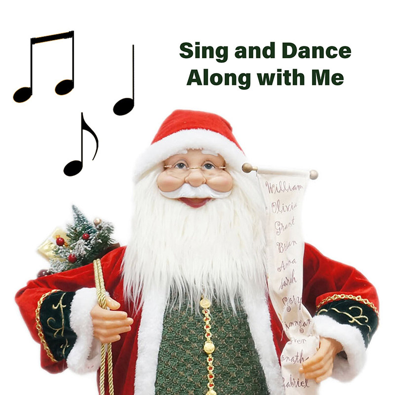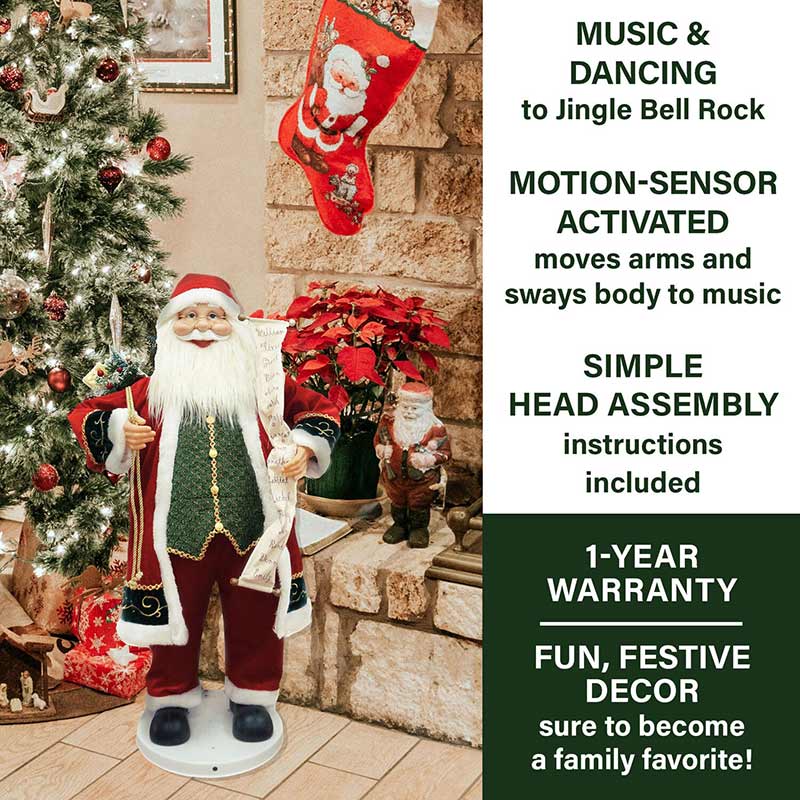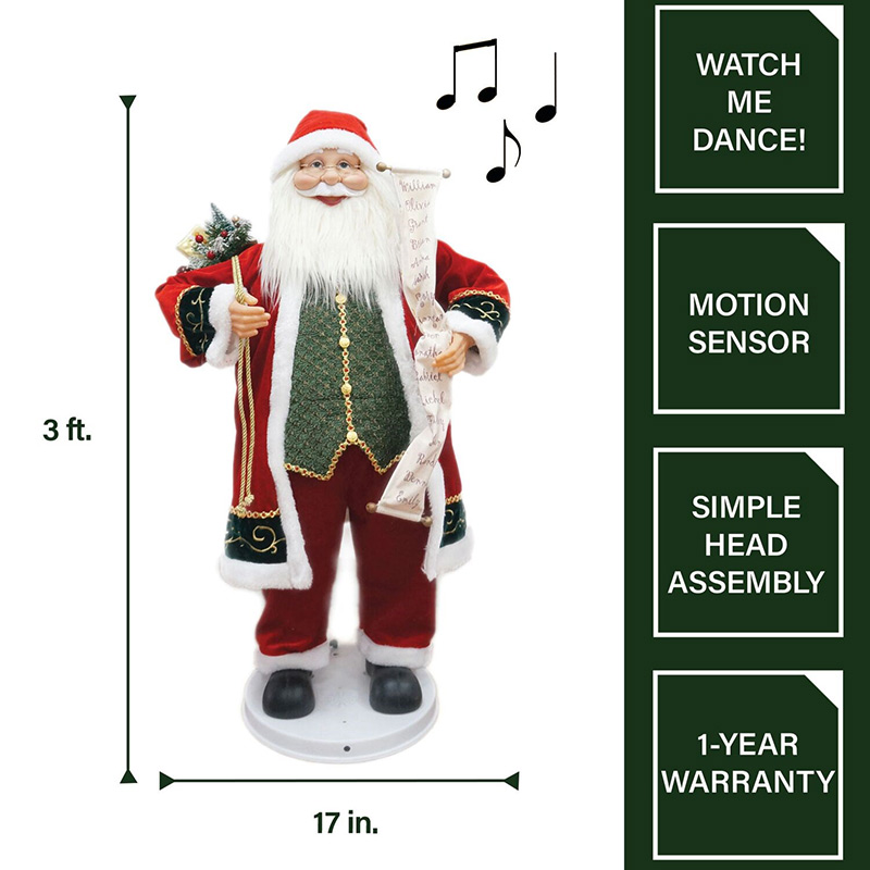 - 3-ft. motion-activated dancing Santa carries his Naughty & Nice list and a sack filled with holiday goodies over his back