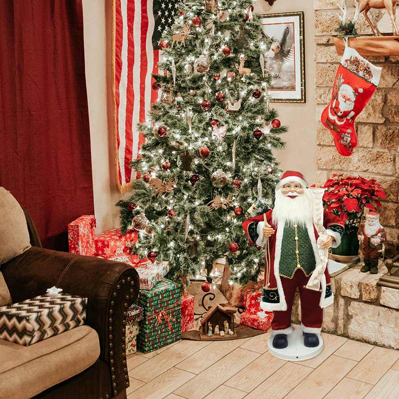 Our dancing Santa from Fraser Hill Farm will delight your family, friends, or customers. He stands 36 inches tall, and he can move his arms and sway his body to Jingle Bell Rock. His friendly face with open spectacles, round chubby cheeks, and a full beard will warm your heart.