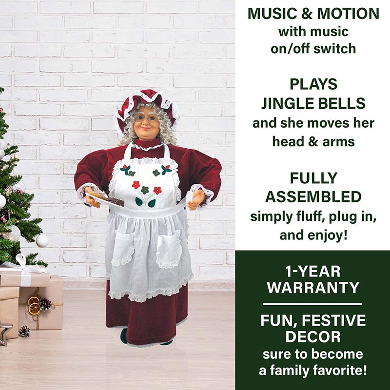 - ANIMATION: Music and Motion Mrs. Claus moves her head and arms with or without music. Easy to operate – just plug her in to see movement! Music on/off button is located under her left sleeve.