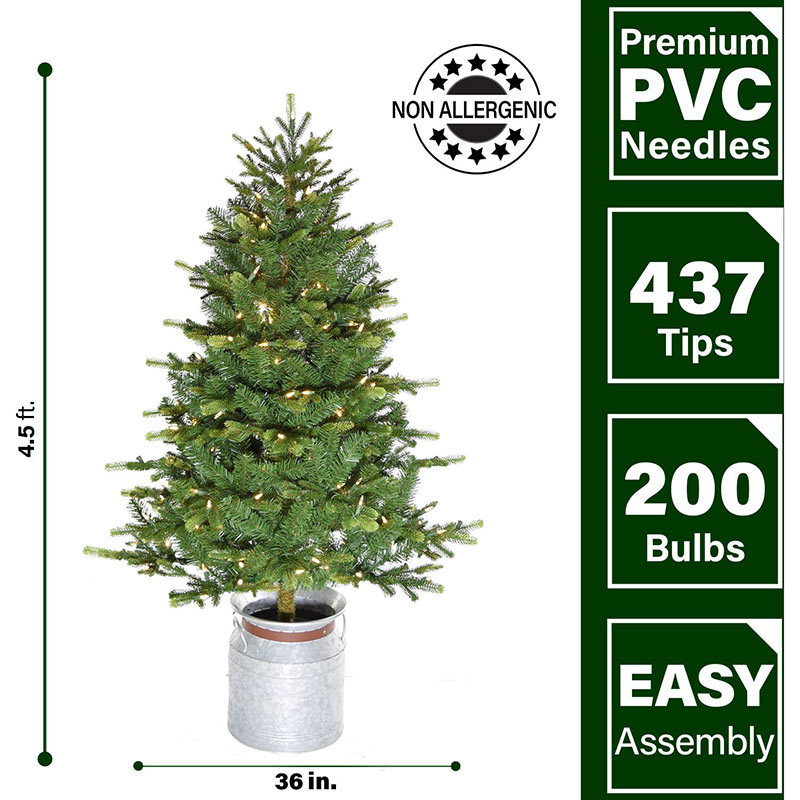 Spruce up your doorway this holiday season with the timeless appeal of these set of two porch accent trees that are potted in rustic farmhouse metal jugs. Spend less time and money this year replacing your natural porch trees. Instead, invest in one of our premium artificial designs that will provide decades of use. come pre strung with 200 warm white bulbs that will illuminate any room, porch, or space this holiday season. Our accent porch trees feature luscious green foliage and are made with quality, maintenance-free materials that will last season after season. The branches display multiple shades of green PVC needles that will instantly add a pop of color and natural look with any frosty scene. Simply unbox, fluff the branches, and enjoy the beauty and long-term benefits that come from owning an artificial design from Fraser Hill Farm.