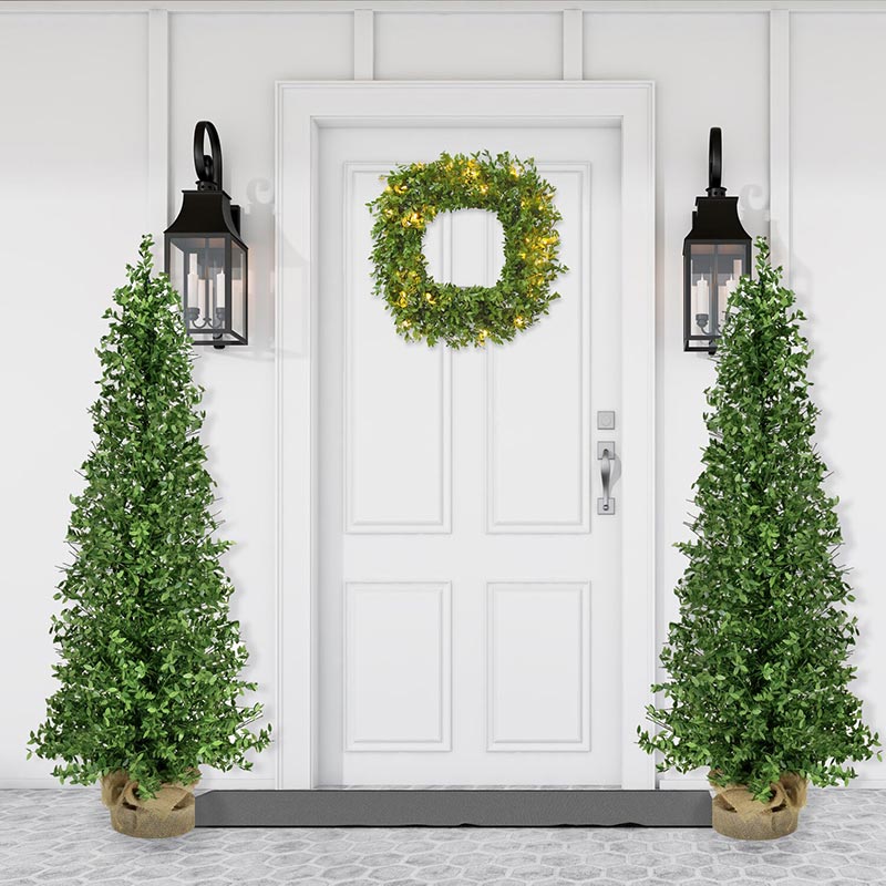 Make a statement with this 4-ft. Boxwood porch tree from Fraser Hill Farm. Featuring lifelike foliage and all-metal structure for strength and durability, this modern tree is specially crafted using the finest materials to look realistic and provide you with many seasons of use and enjoyment. The boxwood leaves are constructed from non-allergenic and flame-retardant materials then painted multiple hues of green so no two are exactly alike. Together these details create the look of a natural shrub that requires hardly any maintenance. Place one in a corner for a lovely pop of green or buy two to frame a door, entryway, or fireplace. If you love a classic boxwood but do not want the maintenance, this is for you. Simply place and display – no clipping or watering required!