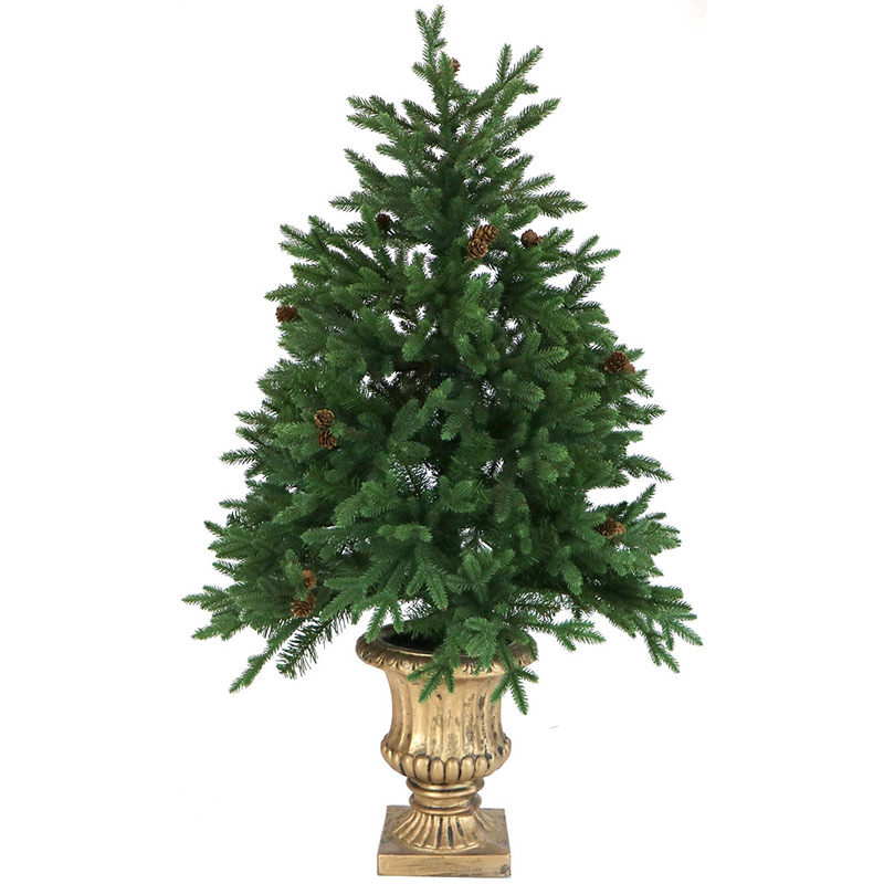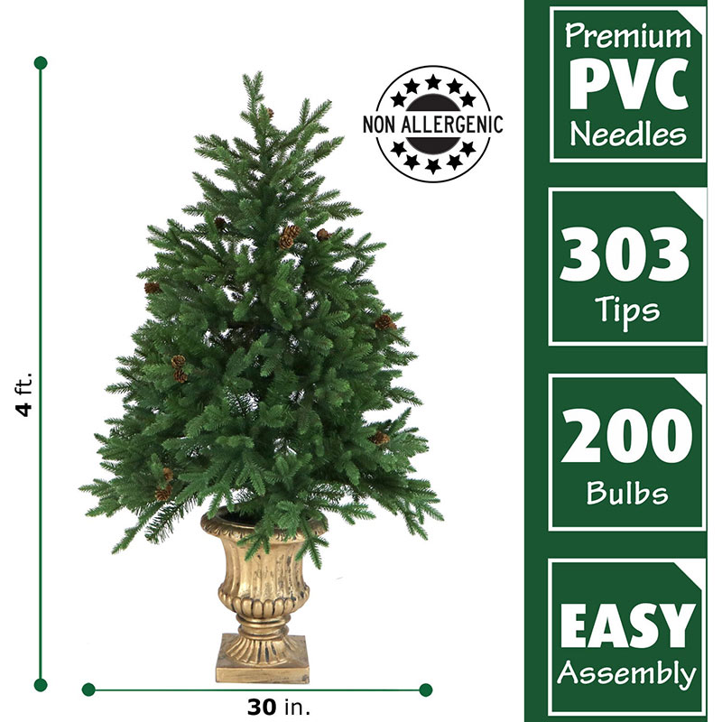 - DESIGNER FINISHES: Handcrafted accent tree trimmed with pinecones and finished gold pedestal urn pot. Pre-lit with festive multi-color LED lights.