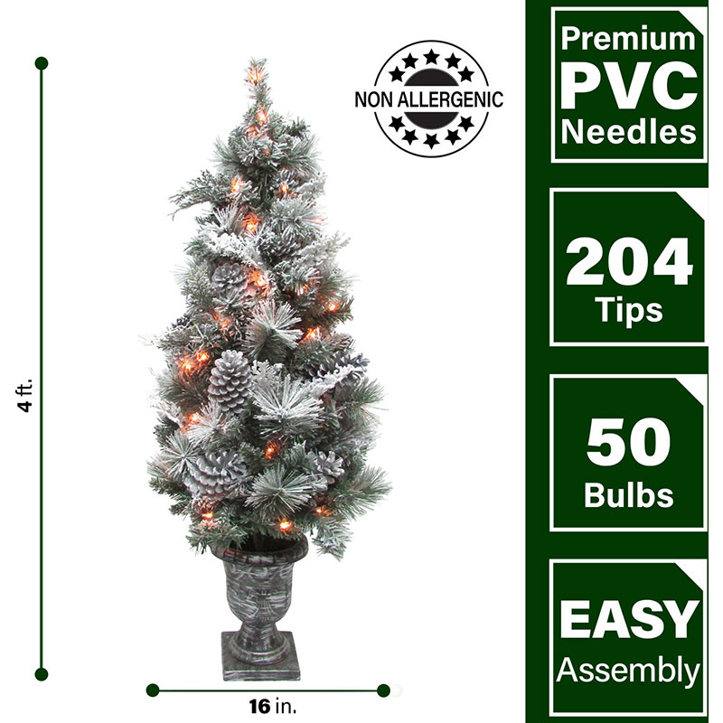 - DESIGNER FINISHES: Handcrafted snow flocked accent tree trimmed with festive oversized pinecones and finished with an ornamental pot. Each prelit with 50 clear lights.