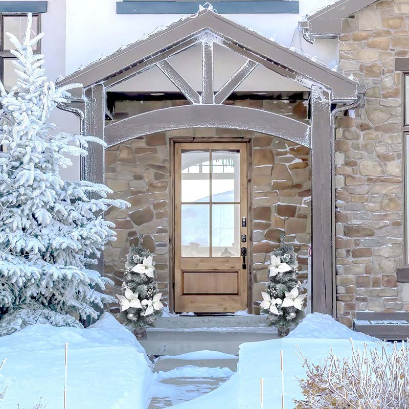 - DESIGNER FINISHES: Handcrafted accent tree trimmed with festive white poinsettia blooms, pinecones, silver and white ornaments, berries, and finished with a pedestal urn pot. Suitable for indoor or covered outdoor use.