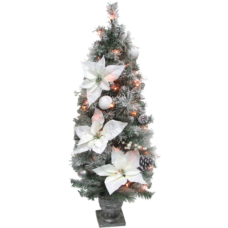 - DESIGNER FINISHES: Handcrafted accent tree trimmed with festive white poinsettia blooms, pinecones, silver and white ornaments, berries. All in a pedestal urn pot. Pre-lit with 50 clear lights.