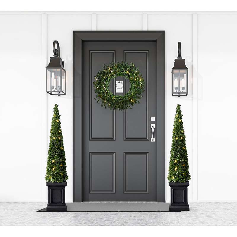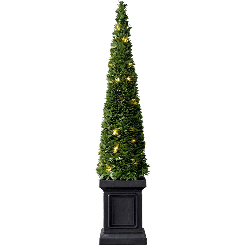 Make a statement with this pair of 40-inch Boxwood topiary cones in square pots from Fraser Hill Farm. Featuring lifelike foliage and all-metal structure for strength and durability, each model is specially crafted using the finest materials to look realistic and provide you with many seasons of use and enjoyment. The boxwood leaves are constructed from non-allergenic and flame-retardant materials then painted multiple hues of green so no two are exactly alike. Together these details create the look of a natural shrub that requires hardly any maintenance. Each prestrung with 50 clear LED lights, this beautiful pair is ideal to flank a door, entryway, or fireplace and instantly elevate the look of your home. If you love a classic boxwood but do not want the maintenance, this is for you. Simply plug in and display – no clipping or watering required!