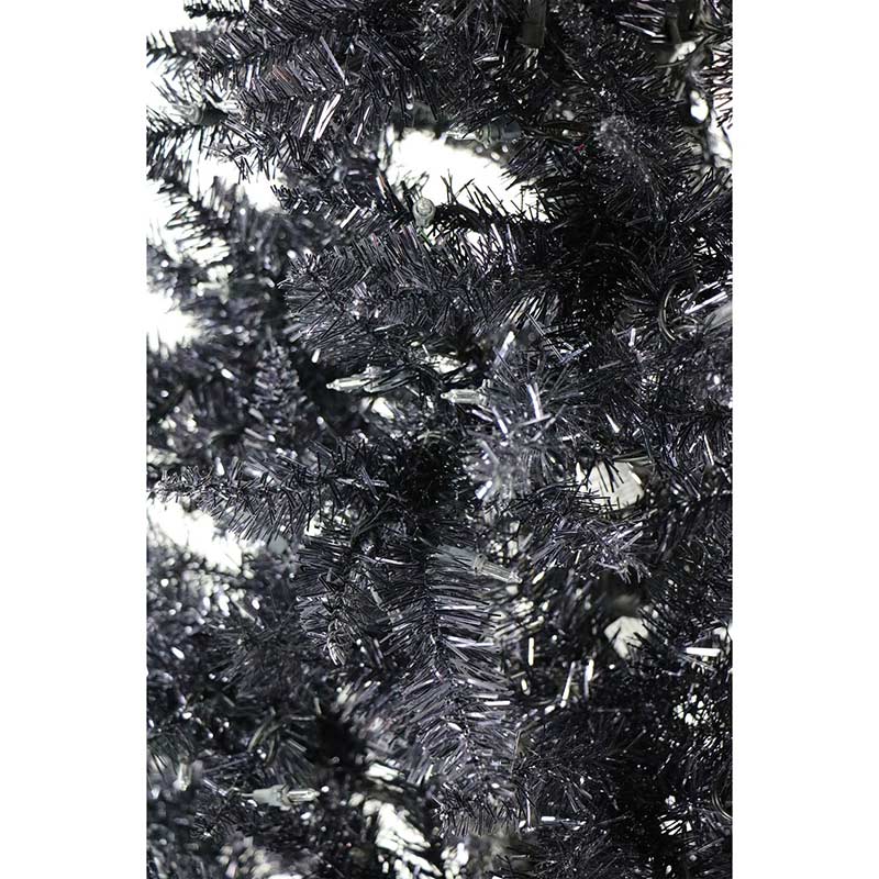 - COLORFUL SHIMMERING FINISH: Shiny tinsel in a bright black hue puts a modern twist on your decorating. Use as your main tree with traditional decorations, as your family’s second tree to hold all the kid’s ornaments, or in your man cave representing your favorite team.