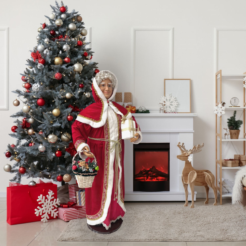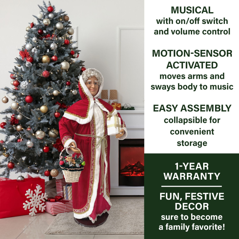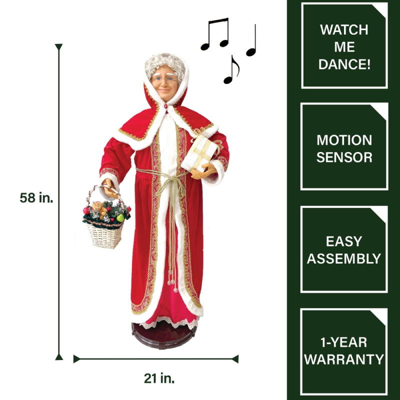 - 58-in. motion-activated dancing Mrs. Claus carrying a holiday basket and wrapped gift box