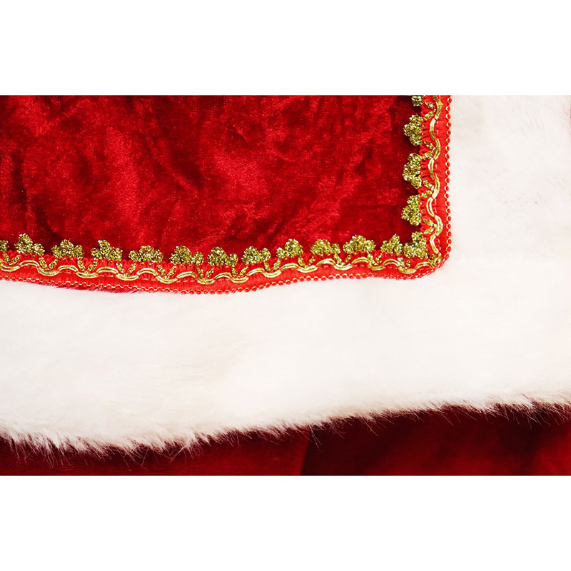 - FESTIVE OUTFIT: Stylishly dressed in a red crushed-velvet suit trimmed with white fur – includes matching cap, green mittens, black boots, and black belt with brass buckle.