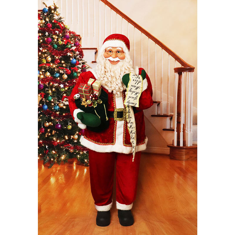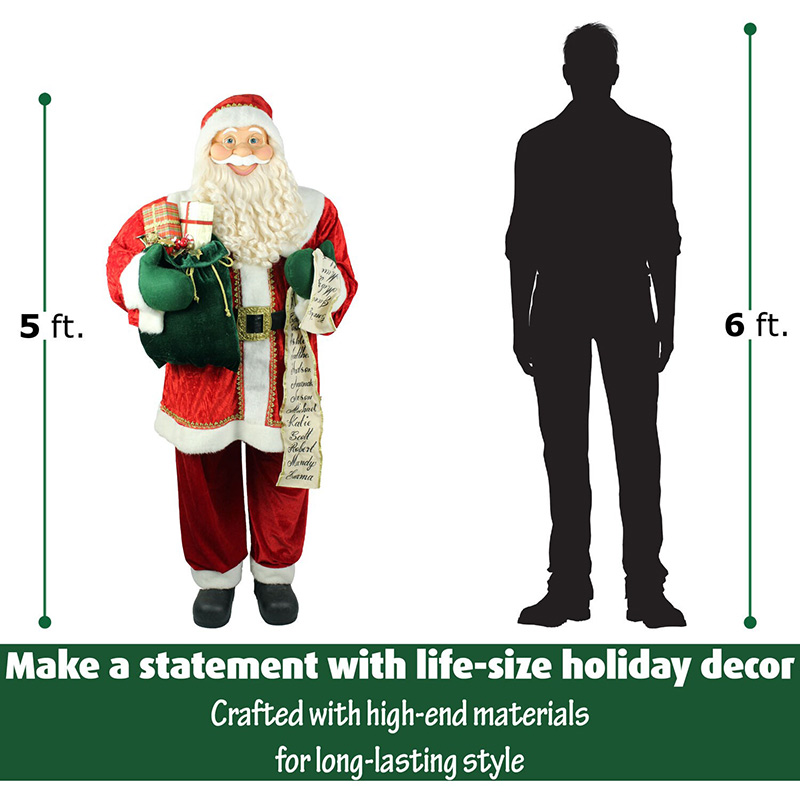 - LIFE-SIZE DISPLAY: 59″ freestanding Santa, holding a gift sack and a scroll with his Naughty & Nice List, greets your family, guests, and Customers with holiday cheer. Measures 59″H x 22.2″ x 13.5″.