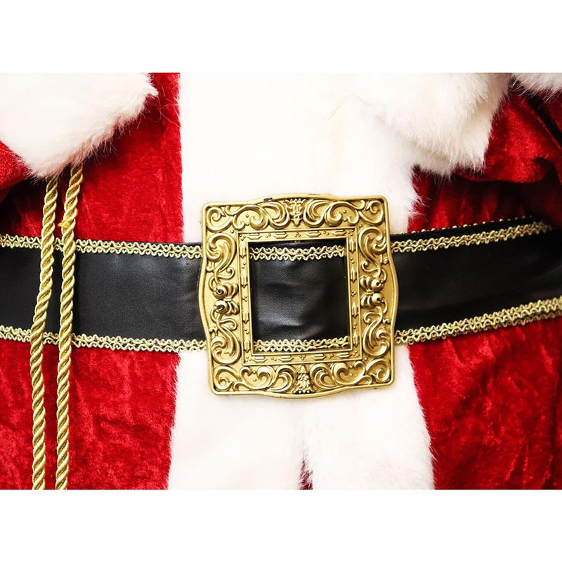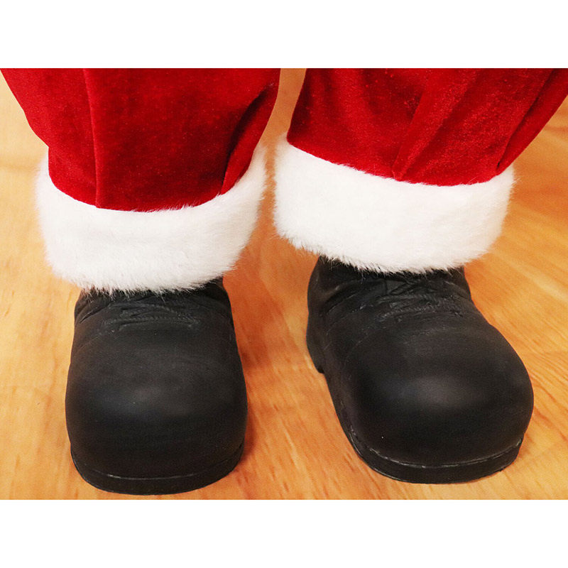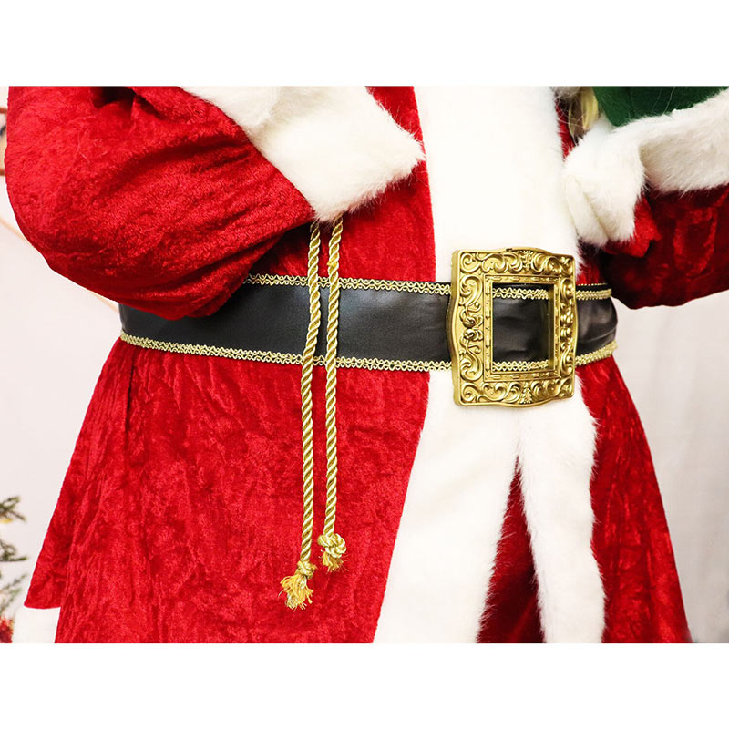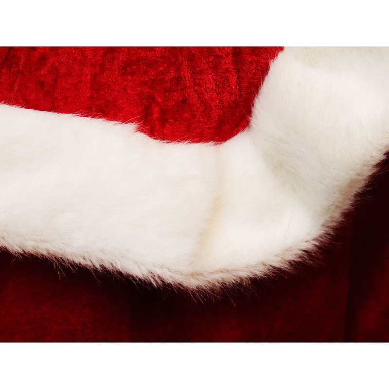 - FESTIVE OUTFIT: Stylishly dressed in a red crushed-velvet suit trimmed with white fur – includes matching cap, green mittens, black boots, and black belt with brass buckle.