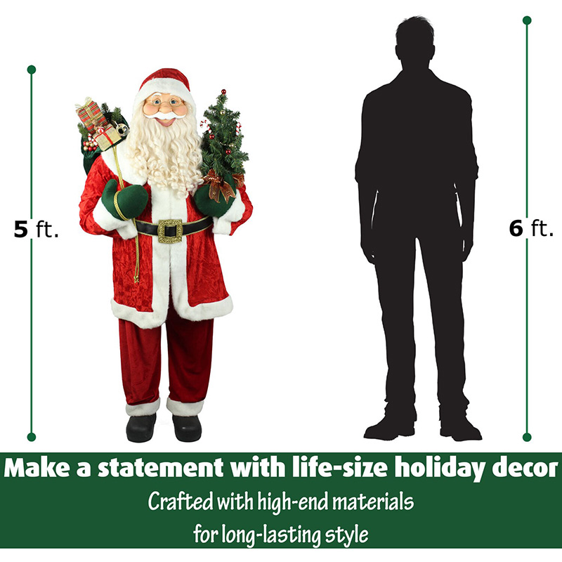 - LIFE-SIZE DISPLAY: 59″ freestanding Santa, carrying a sack full of gifts and a mini Christmas tree, greets your family, guests, and Customers with holiday cheer. Measures 59″H x 22.2″ x 13.5″.