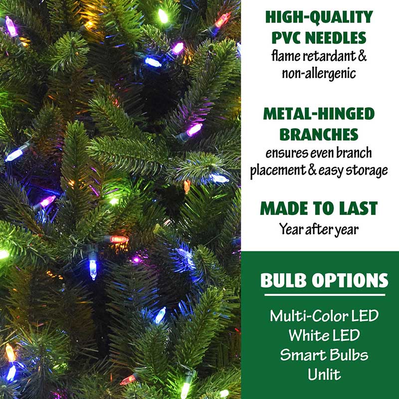 - EASY CONNECT TECHNOLOGY AND LONG LASTING MULTI-COLOR LED LIGHTS: Pre-strung with 550 multi-color LED lights to bring a festive glow to your home. Instant one-click connection makes assembly a snap. No wires, no hassle – one plug for the whole tree.