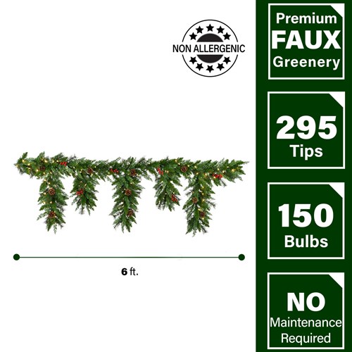 It’s pre-strung with battery-operated LED string lights that add a sparkle and holiday charm to the overall display. A discrete battery box is hidden within the branches and provides cordless light operation with the freedom to hang the garland wherever you like. With 295 tips there’s plenty of room for you to customize the look with bows, ornaments, and other accoutrements. Hang this garland on your staircase, shelf, or mantel and greet each guest with holiday cheer that will last from one season to the next.