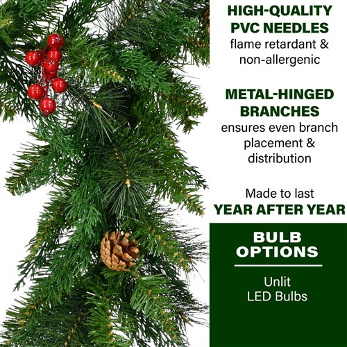 - Beautifully crafted with traditional green pine branches and trimmed with red berries and pinecones to provide years of enjoyment