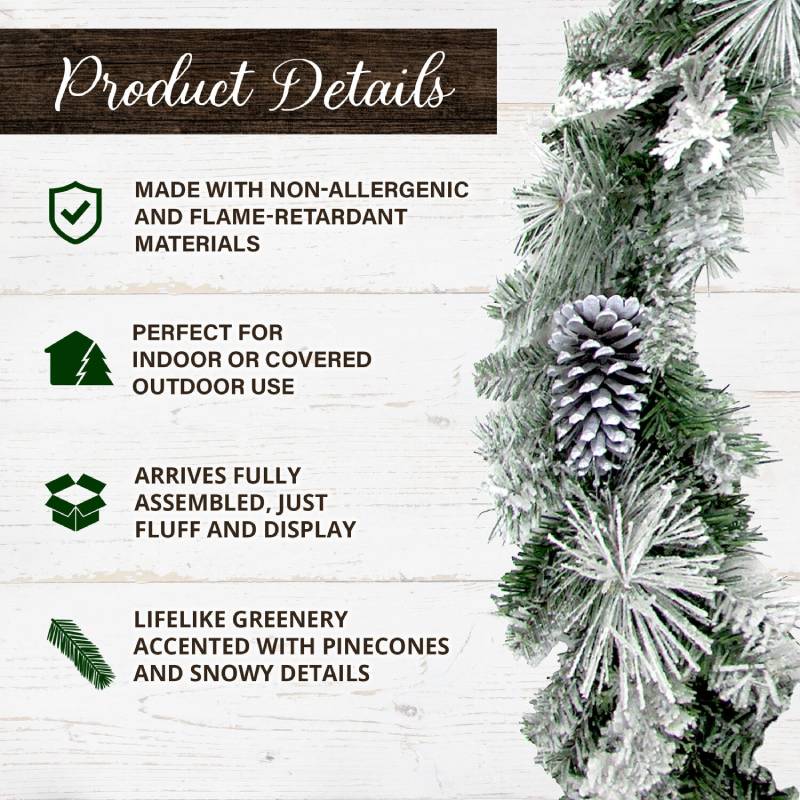 - Handcrafted snow flocked garland trimmed with festive multi-sized pinecones. Suitable for indoor or covered outdoor use.