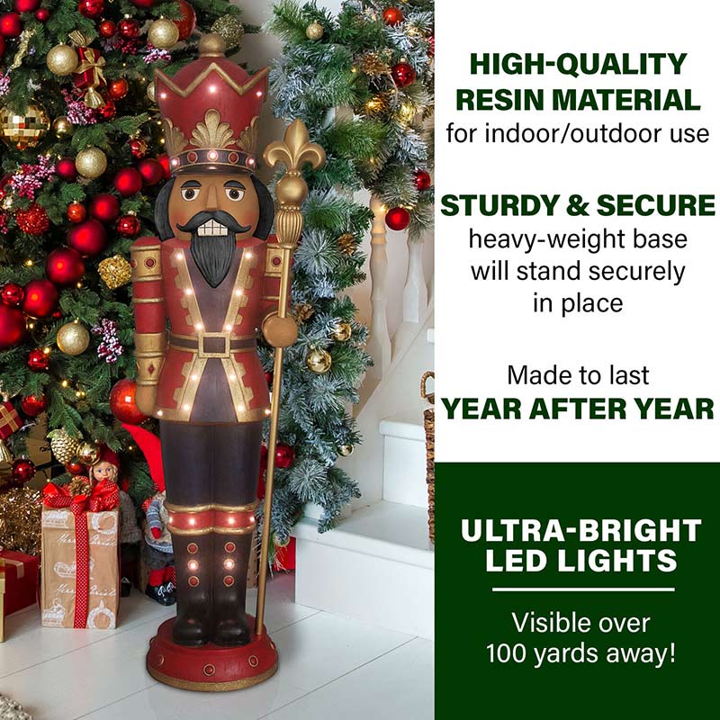 - FESTIVE HOLIDAY DECOR: Decked out in his finest red jacket, black pants, black boots, festive crown and holding a gold staff this large nutcracker is ready to greet your guests near the tree, by your door, next to the fireplace, or on the porch.
