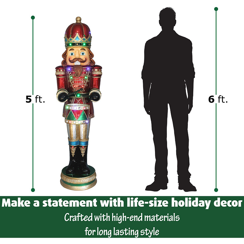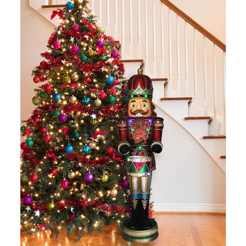 Capture the beauty, magic, and wonder of the Holiday Season with oversized Christmas decorations from Fraser Hill Farm. Our collection of indoor/outdoor resin figures will help you create a delightful holiday display everyone will love. Each high-quality statue is crafted from weather-resistant resin then brightly painted with realistic details. Collect them all! This animated Nutcracker will play his snare drum for you and your guests as holiday music plays along. Sing along to 8 family favorites including We Wish You a Merry Christmas. Easy set and forget timer provides eight hours of non-stop entertainment complete with moving hands, music, and 20 multi-color LED lights. For irresistibly unique decor that celebrates the spirit of Christmas, count on quality products from Fraser Hill Farm.
