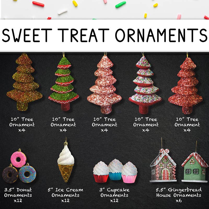 - MIXED-MATERIAL ORNAMENTS AND DÉCOR: No more boring Christmas tree or décor! This is not your typical 152-piece set of bulbs only. Not only does it include a stunning sherpa-trimmed plaid tree skirt, it includes: a whimsical gingerbread tree topper, shatter-resistant bulbs of varying sizes, plush door hangers, standing plush figurines, glittery resin gingerbread houses, and the sweetest assortment of donut, ice cream, and cupcake shaped ornaments. This is truly a decorator’s dream set!