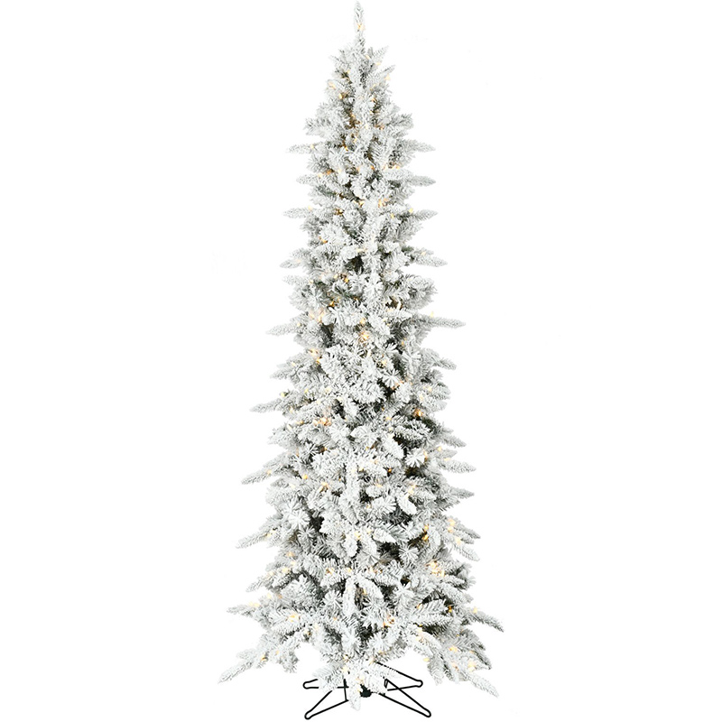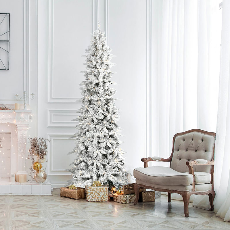 - 7.5-FOOT SLIM TREE: Standing 7.5-Ft. tall this beautiful snowy flocked tree will fit perfectly in your room with 8-ft. to 9-ft. ceilings. The 42 inch slim diameter is great for small spaces, apartments, or as your second, third, or fourth tree!