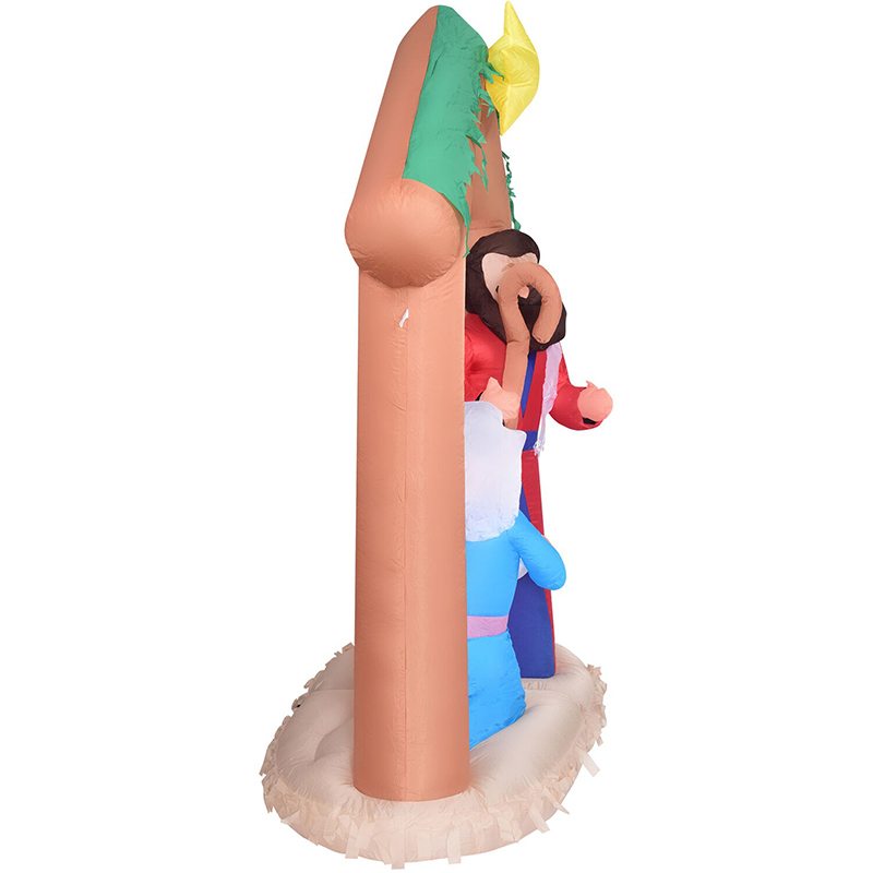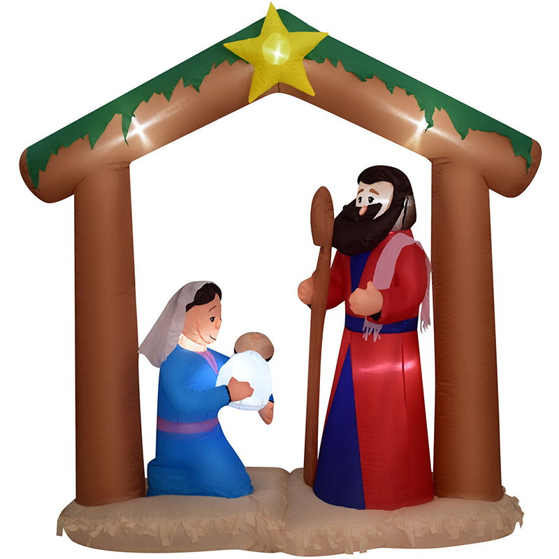 - Inflatable Nativity Scene with Mary, Joseph, and baby Jesus illuminates day and night with 7 internal white LED lights