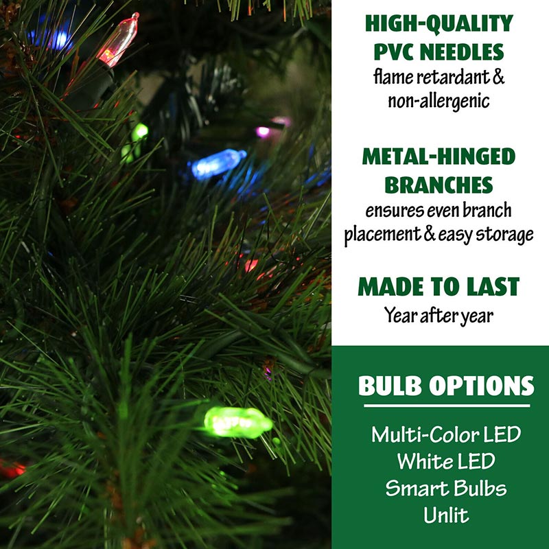 - EASY CONNECT TECHNOLOGY AND LONG LASTING MULTI-COLOR LED LIGHTS: Pre-strung with 600 multi LED lights to bring a festive glow to your home. Instant one-click connection makes assembly a snap. No wires, no hassle – one plug for the entire tree.