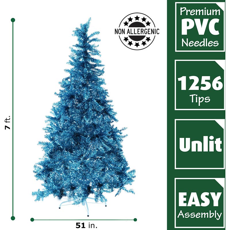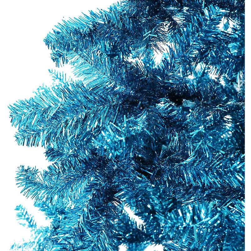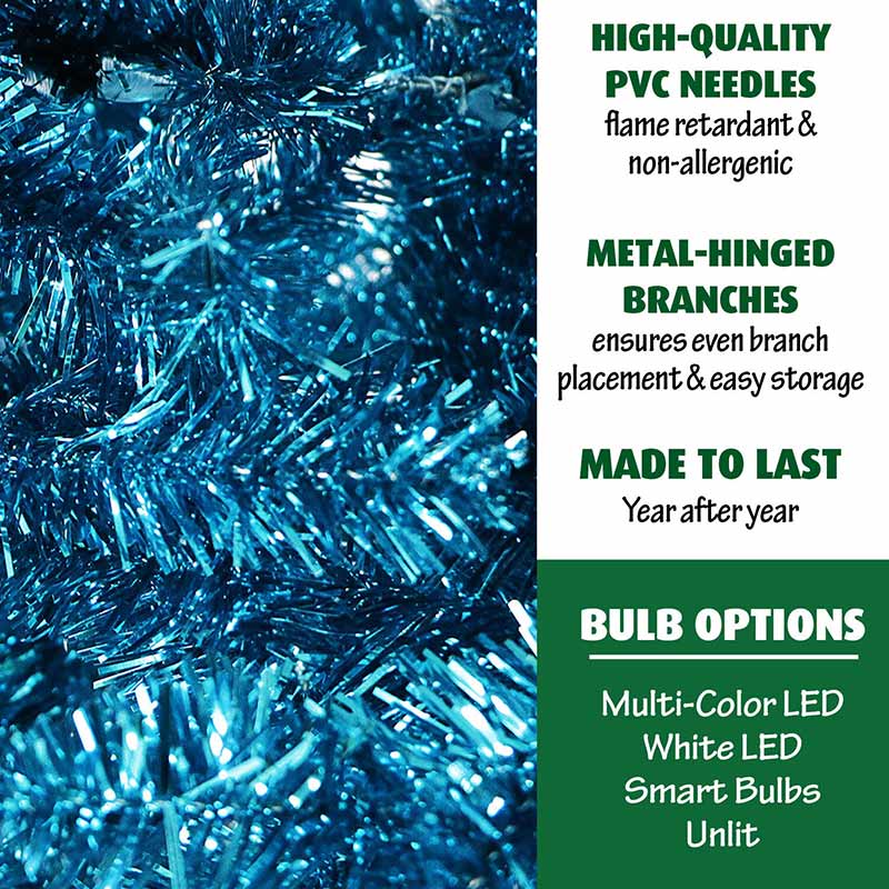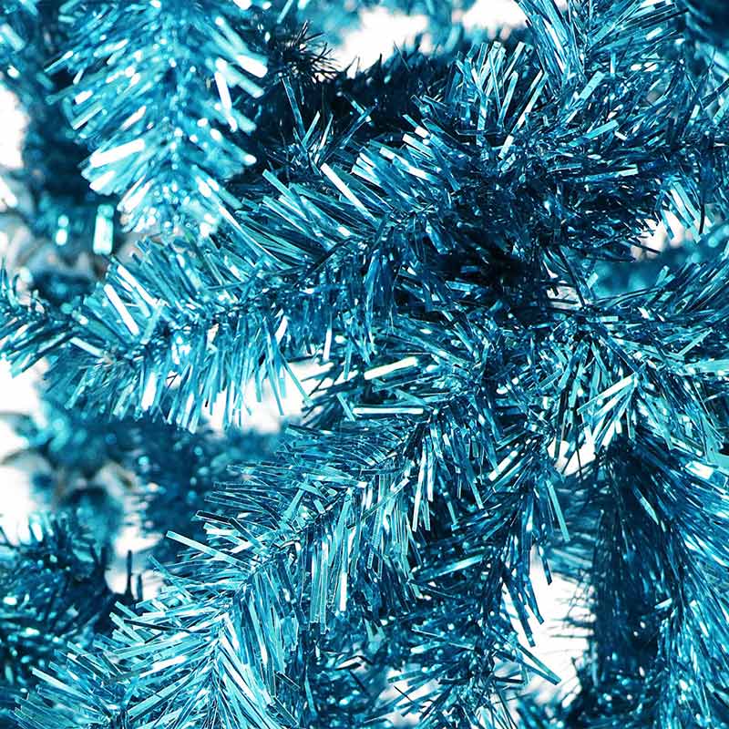- COLORFUL FASHION FINISH: Shiny tinsel in a bright turquoise hue puts a playful twist on your Yuletide decorating. Use as your main tree with traditional decorations or as your family’s second tree to hold all the kid’s precious handcrafted ornaments. Use in your man cave to represent your favorite team.