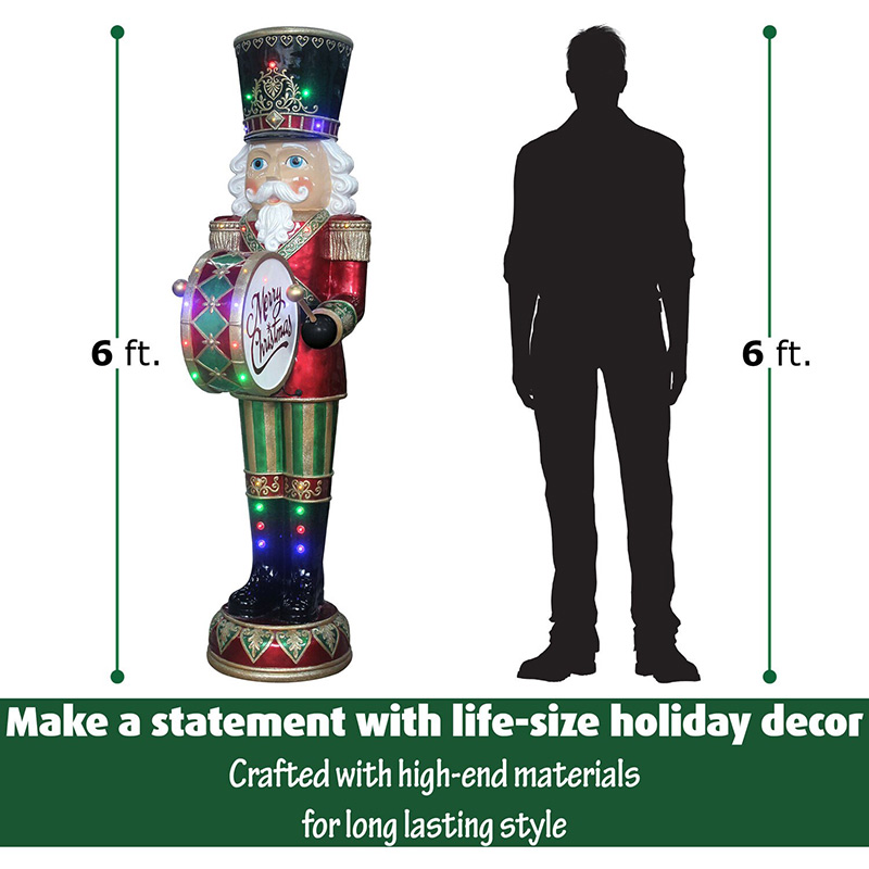 - 6-ft. animated nutcracker with bass drum moves his hands to the music