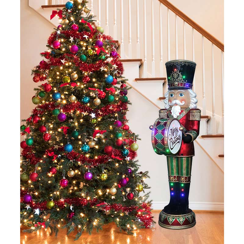 This animated 6-feet tall Nutcracker will play his bass drum for you and your guests as holiday music plays along. Sing along to 8 family favorites including We Wish You a Merry Christmas. Easy set and forget timer provides eight hours of non-stop entertainment complete with moving hands, music, and 32 multi-color LED lights. For irresistibly unique decor that celebrates the spirit of Christmas, count on quality products from Fraser Hill Farm.